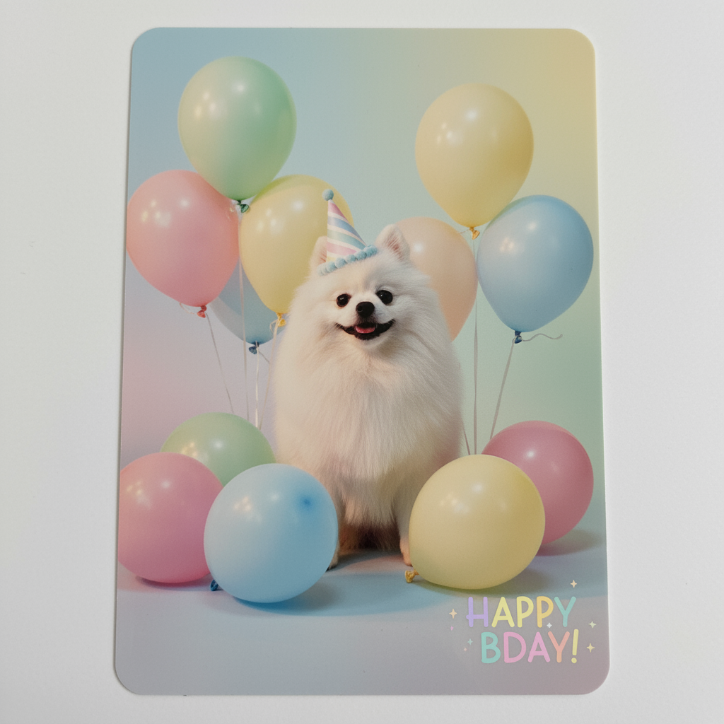 “이 이미지로 포토카드를 만들어줘. 생일 파티 모자를 쓰고 풍선 옆에 앉아 있는 모습, 파스텔톤 배경, 따뜻한 조명으로”