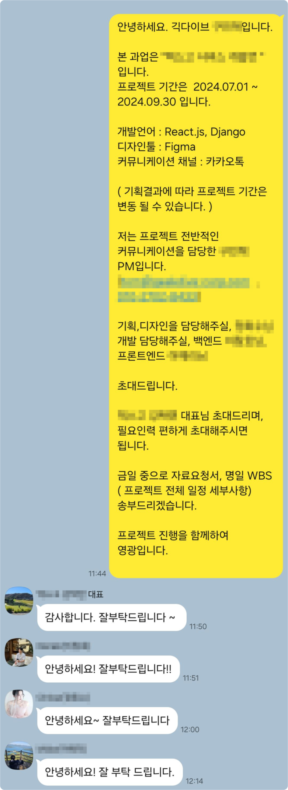 프로젝트가 시작되면 카카오톡 단체방이나 슬랙 채널을 개설합니다.