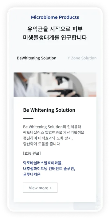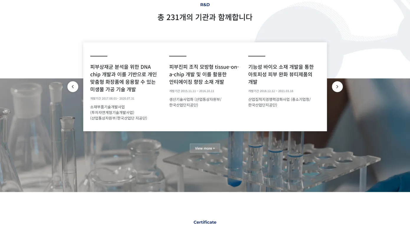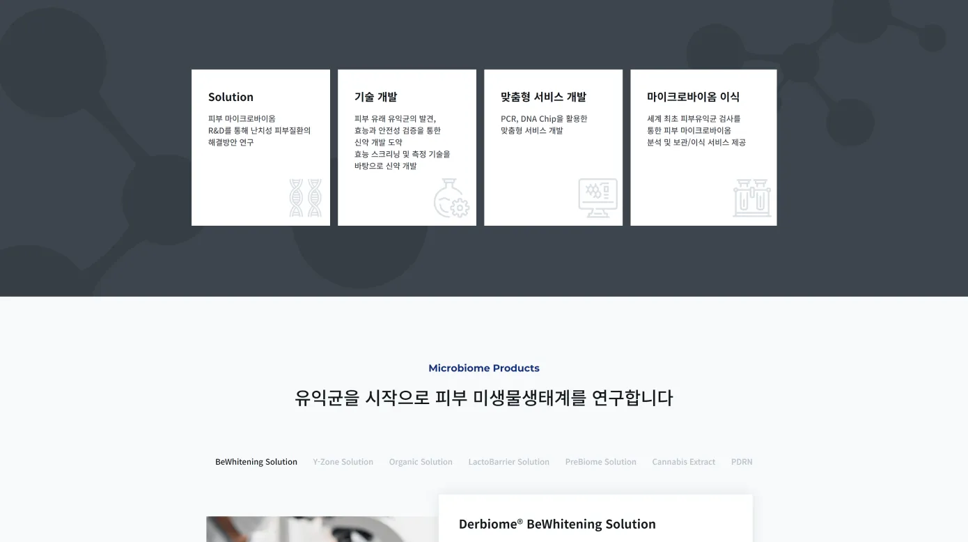 기존 화장품 회사의 브랜드 이미지를 새롭게 탈바꿈하기 위해 전문성을 보여줄 수 있는 이미지를 히어로 섹션에 배치했습니다.
