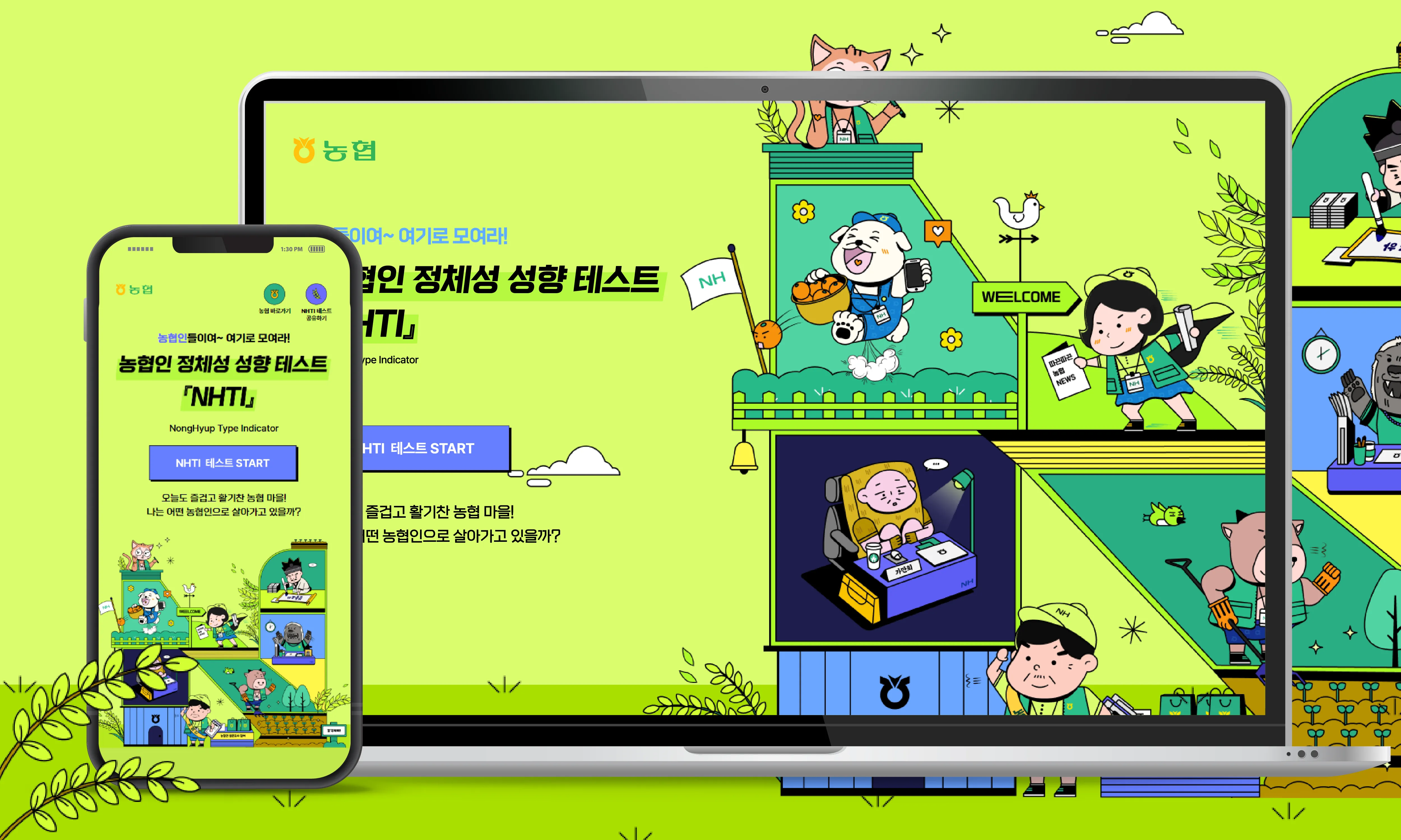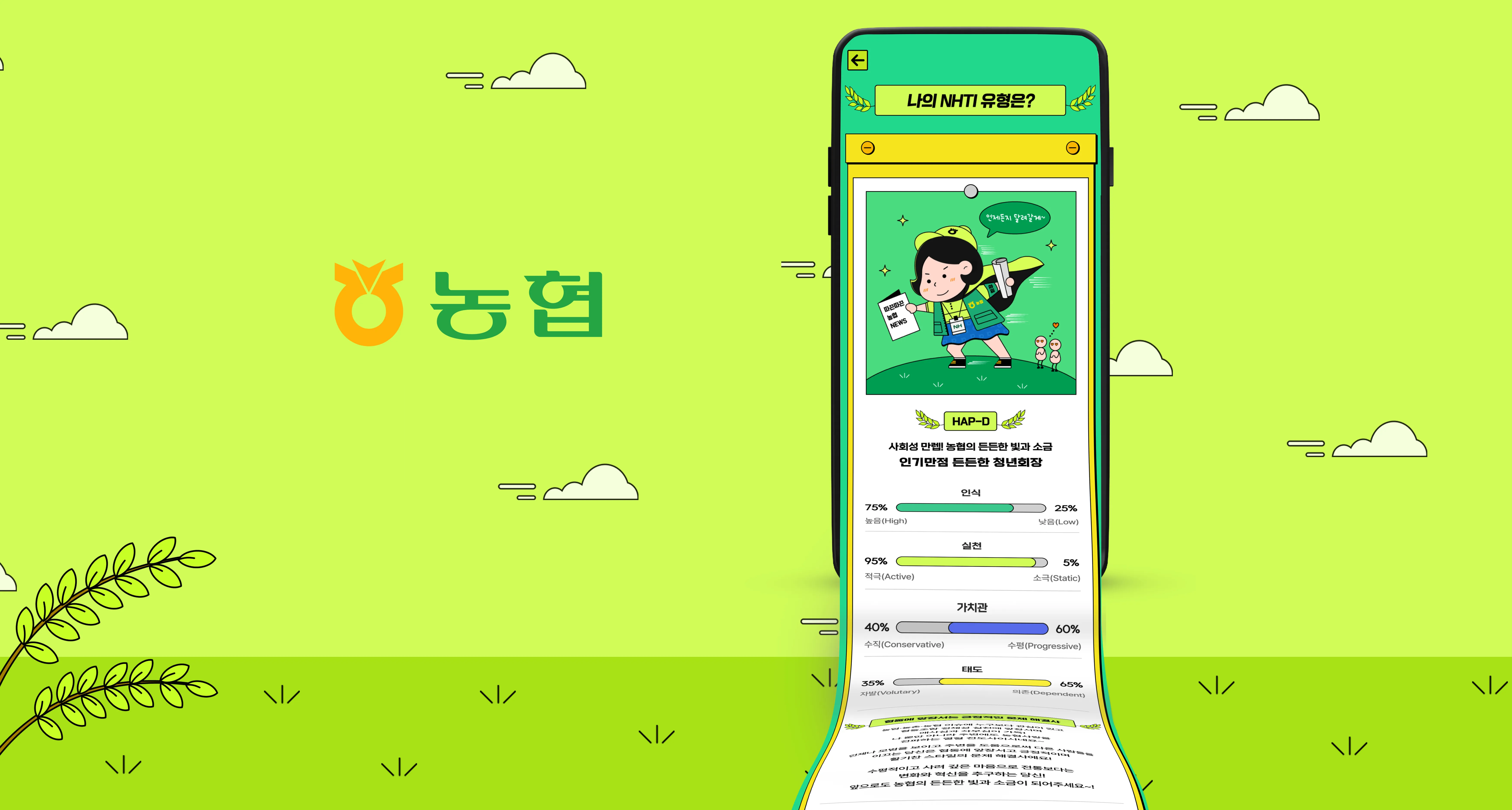 농협중앙회의 최상위 서비스 목적은 “안정적인 트래픽 처리 & 특색있는 UI 디자인” 이었습니다. MBTI 형식 테스트로 진행한 은행 홈페이지 농협중앙회의 경우, 안정적인 서버 설계 및 농협중앙회만의 독특하고 신선한 UI 디자인을 선보여야 했습니다. 이후 바이럴이 일어날 수 있도록 광고 퍼널 기획을 도입해 단순 테스트로 끝나는 것이 아닌 링크를 통한 새로운 유저의 유입이 일어날 수 있도록 기획하고 설계했습니다.